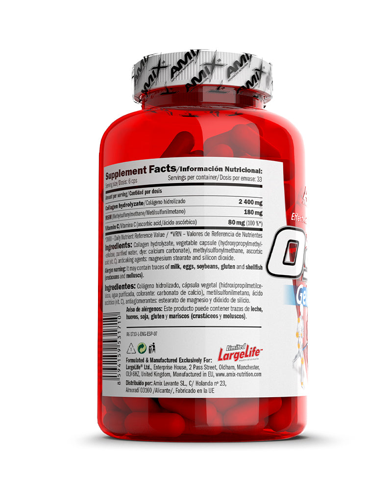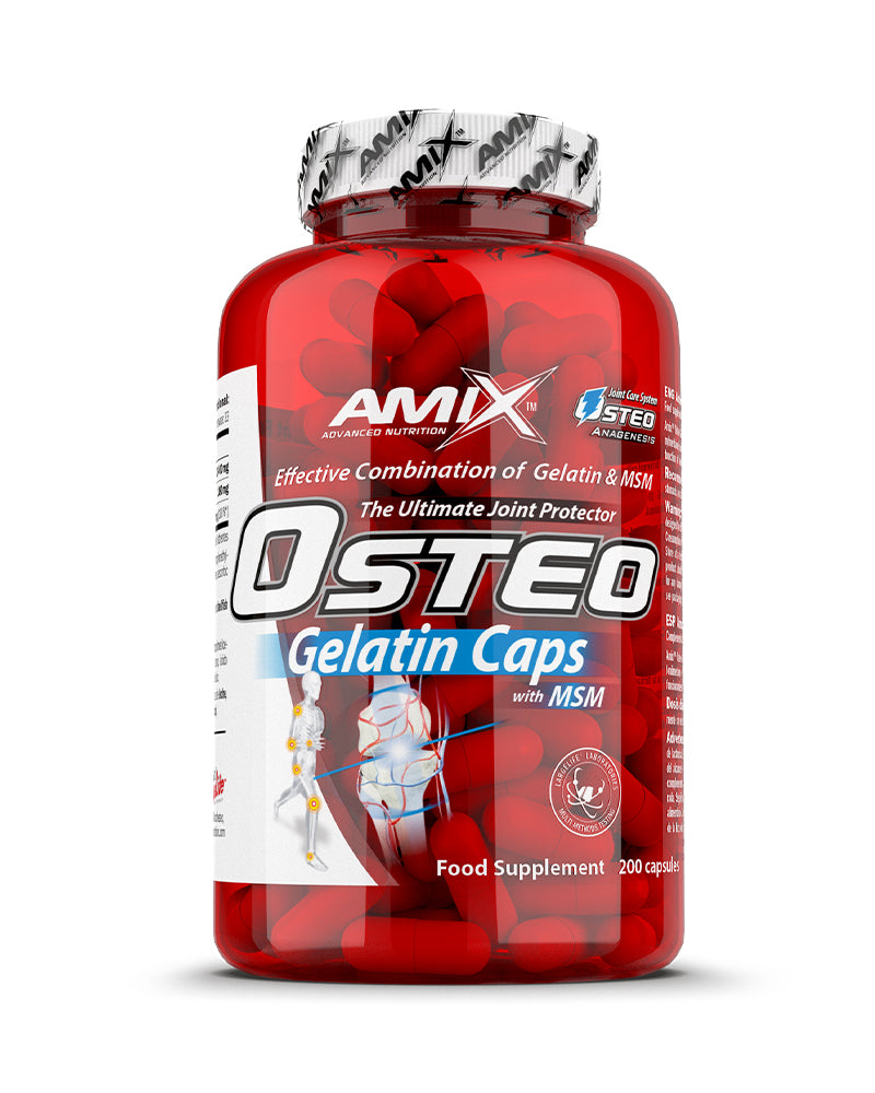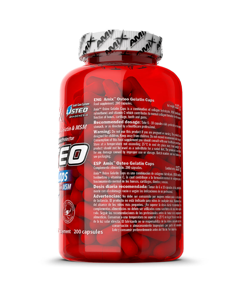 Amix™ Osteo Gelatine es un suplemento en cápsulas elaborado a base de gelatina hidrolizada, una fuente natural de colágeno que contribuye al mantenimiento de los tejidos conectivos y al cuidado articular. Diseñado para personas activas o con desgaste físico, este complemento apoya la movilidad y la integridad de huesos, tendones y cartílagos.